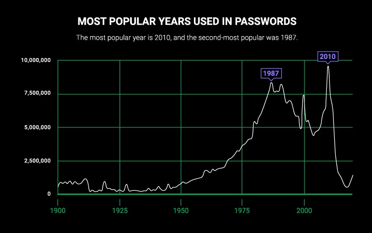 - Prevalence: Roughly 10% of all passwords, often incorporating significant personal or historical dates. Those can be birthdates, anniversaries, graduation dates, etc. The preference for date-based passwords underscores the challenge of creating something both memorable and secure.