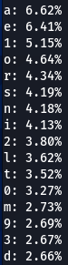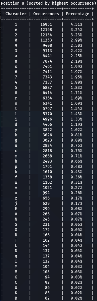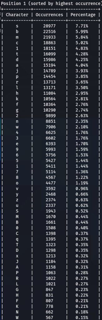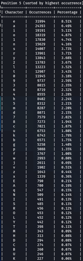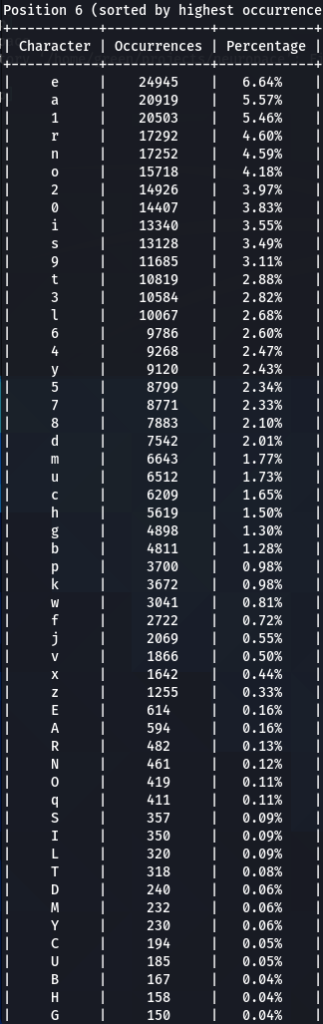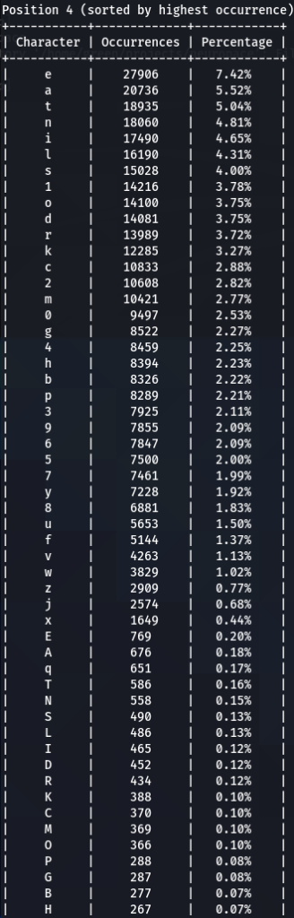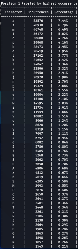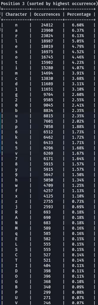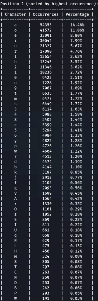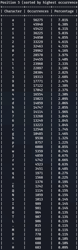 Here we have our first finding, character ‘a’ is encountered at the top nearly every time. Followed by ‘e’, ‘1’, ‘o’, ‘i’, ‘r’, ‘s’. Some patterns are exactly the same, like letter ‘d’ being exactly on the 16th position of three (out of five displayed above) word-lists.