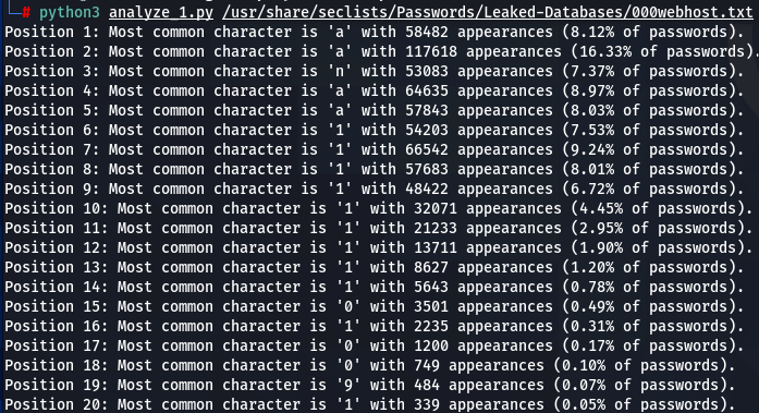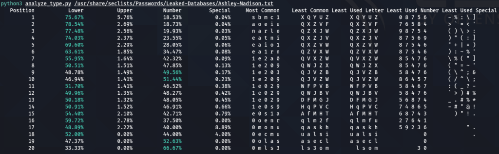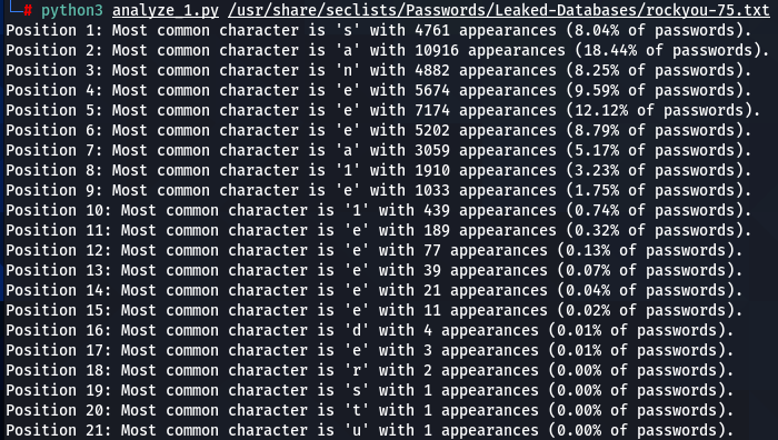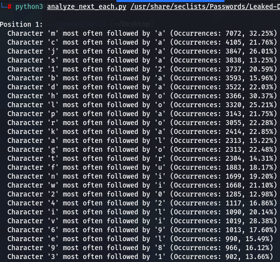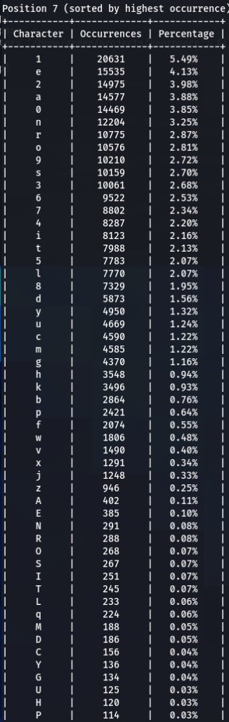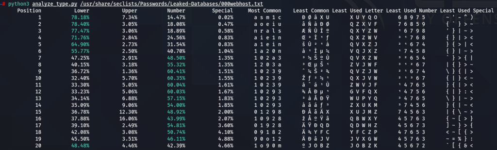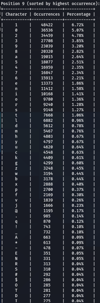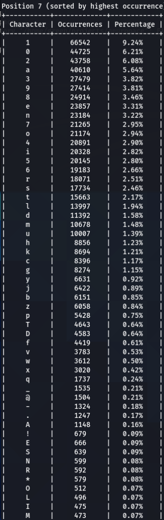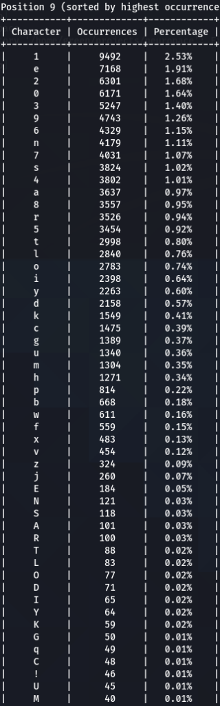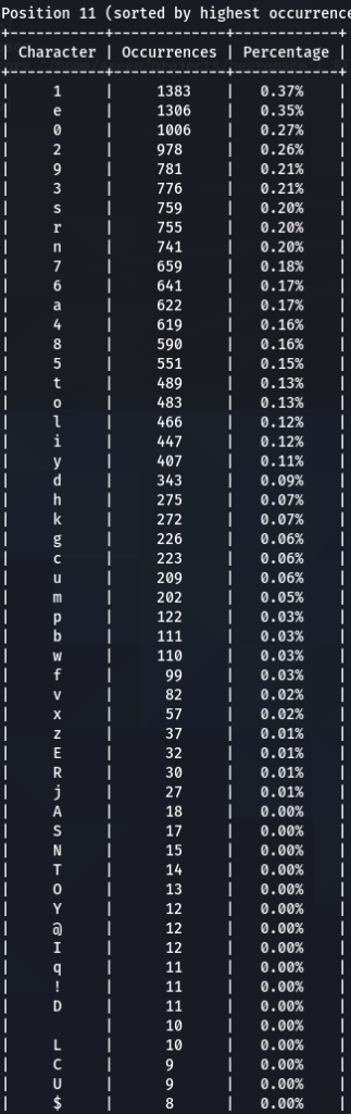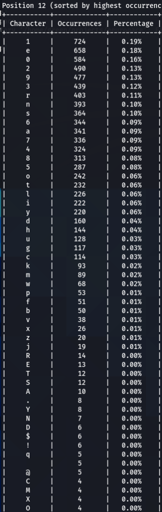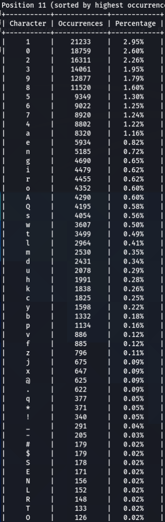 How does character positioning influence password patterns? To explore this, I’ve developed a script that identifies the most frequently occurring characters at each specific position within passwords. Let’s examine the findings to see if we can discern any intriguing new patterns.