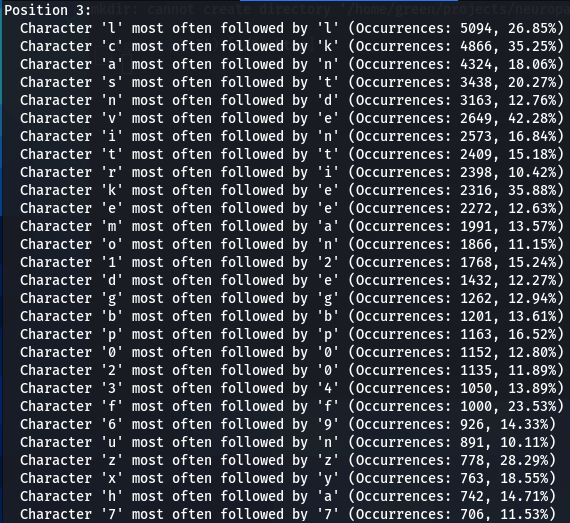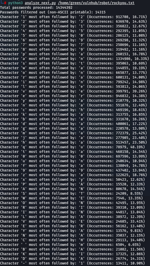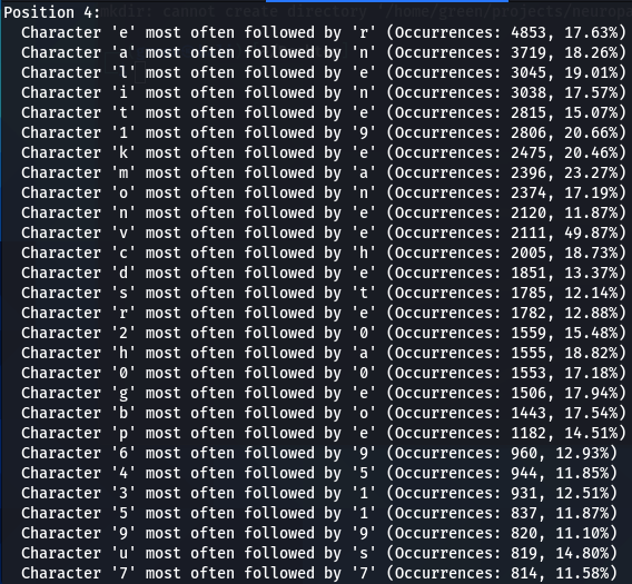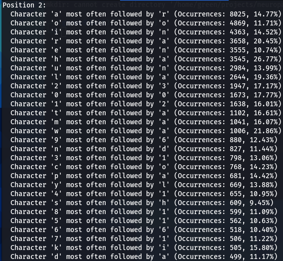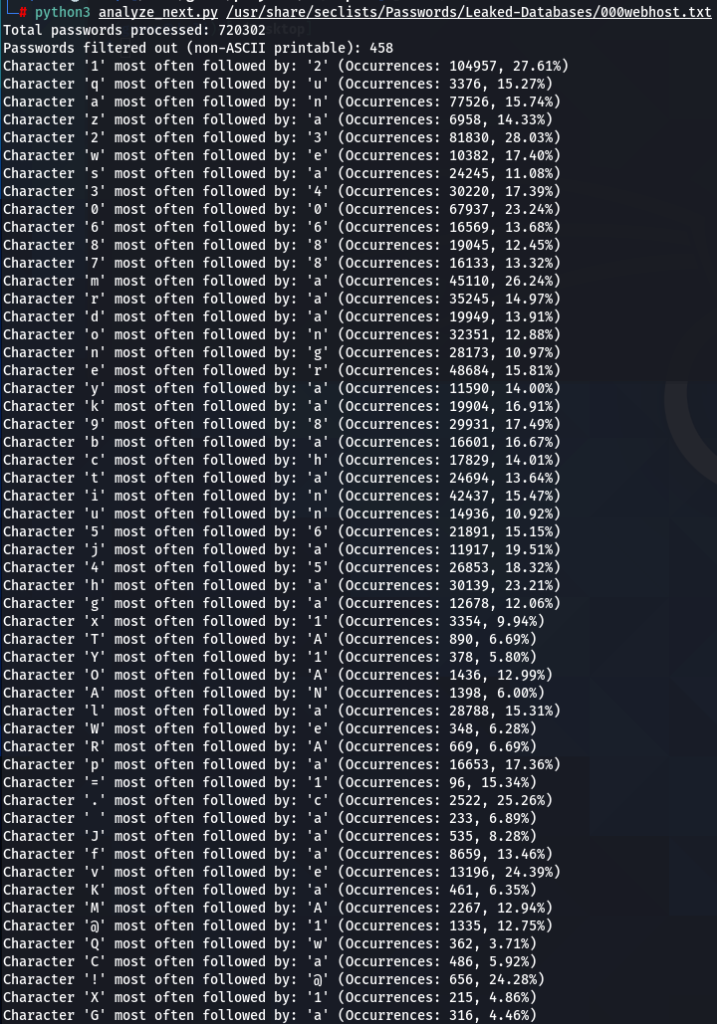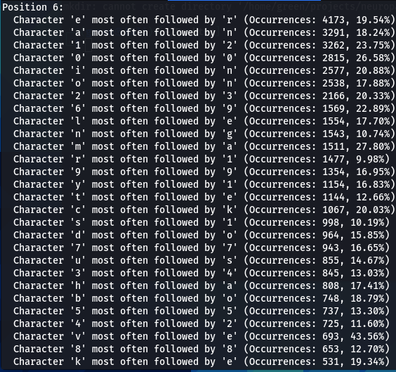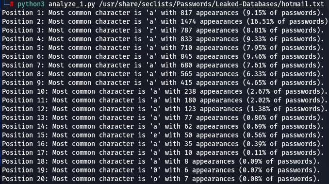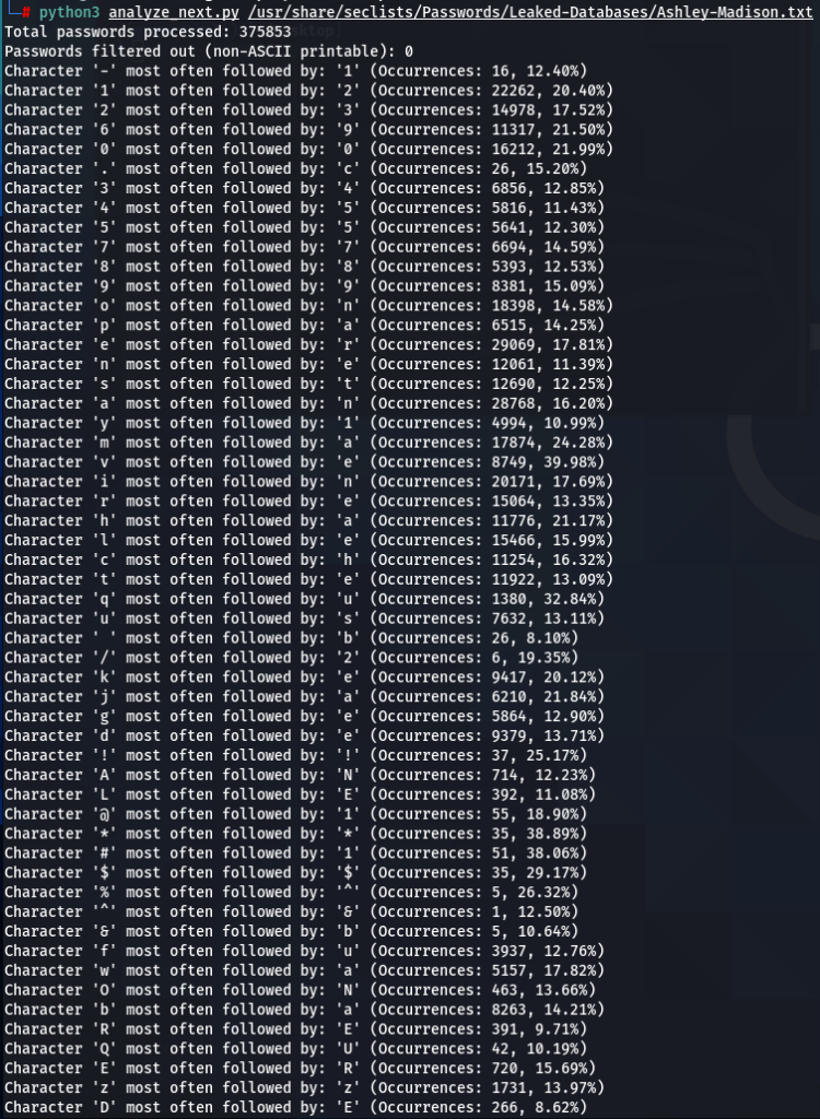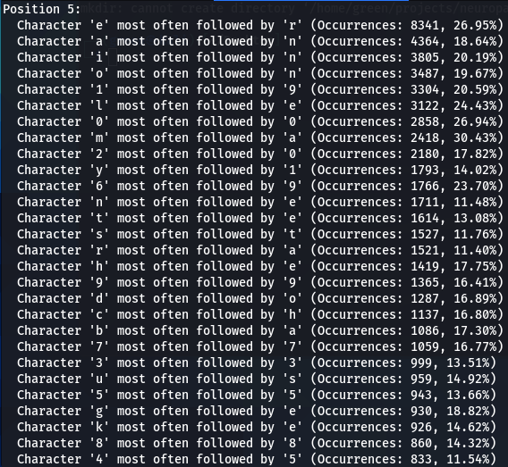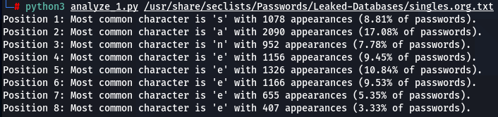 How does character positioning influence password patterns? To explore this, I’ve developed a script that identifies the most frequently occurring characters at each specific position within passwords. Let’s examine the findings to see if we can discern any intriguing new patterns.