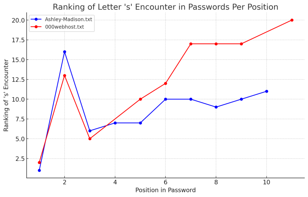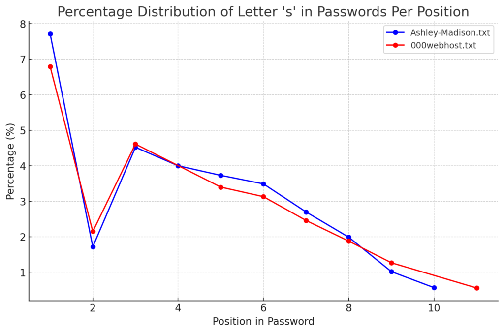 - In analyzing two of the largest datasetsβ000webhost.txt and Ashley-Madison.txt, millions of passwords – an interesting trend emerges. Beginning from the 6th or 7th position and continuing through to the 14th, the most commonly encountered character is the number ‘1’. This pattern suggests an increased preference for using numbers, particularly ‘1’, in the mid to later segments of passwords. While earlier positions are dominated by letters, with ‘s’ and ‘a’ being the most frequent, a shift towards numerical characters is observed in the subsequent positions, highlighting a distinct pattern in password composition.