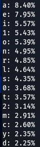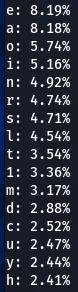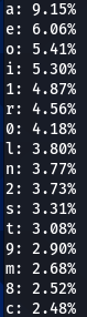 Now lets do a bit more comparative analysis. What characters are most often following other characters? For instance, which character is most commonly found after letter ‘a’? My next script was designed to calculate that.