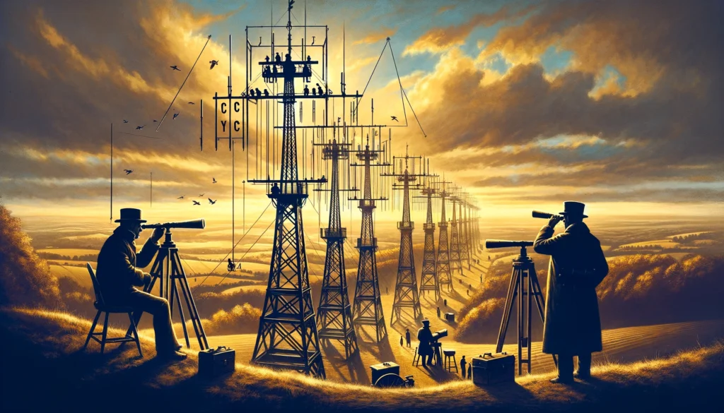 The Blanc brothers’ scheme to intercept telegraph messages involved a system in France called semaphore telegraph. It was a network, operational since 1794, consisting of towers equipped with rotating pieces of metal, which could be positioned to represent different symbols, forming a code that was relayed from tower to tower. Operators at each station would use telescopes to observe the symbols displayed by the preceding tower and then replicate those symbols for the next tower to see, allowing messages to traverse across the country at unprecedented speeds for the time.